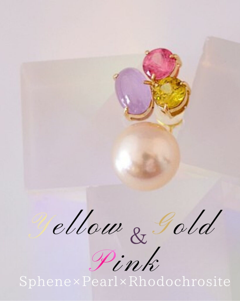イヤードレス パールバックキャッチピアス Material:ロードクロサイト,スフェーン,南洋真珠,ラベンダージェイド,K18YG